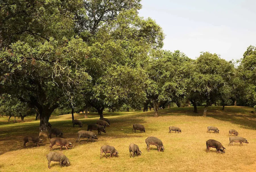 Jamón ibérico de bellota, de cerdos criados de manera sostenible en las dehesas del norte de Sevilla y curados con mimo en la sierra de Aracena, Huelva.
